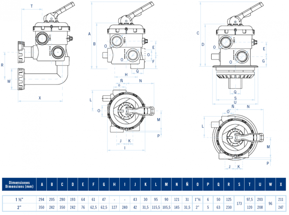 Šesťcestné ovládacie ventily sú používané pre prepínanie šesť hydraulických operácií filtračného procesu: filtrovania, preplach, sedimentačnej preplach, recirkulácie, vypúšťanie a zatvorené. Telo ventilu, veko aj ovládacia páka vyrobené z ABS plastu, rozvádzač z PPO, tesnenie u neoprénu a kovové časti z nerezovej ocele.