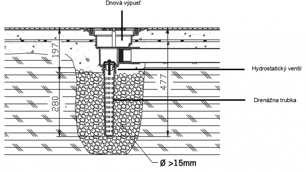 Pre vyrovnanie tlaku pôsobiaceho na dno bazéna, ktorý môže spôsobiť podzemná voda, sa odporúča inštalácia hydrostatického ventilu a drenážnej trubky do dnovej výpusti. Hydrostatický ventil zabraňuje riziku poškodenia bazénovej nádoby tým, že umožňuje spodnú vodu vniknúť do bazéna v dostatočnom objeme na vypustenie tlaku na nádobu.