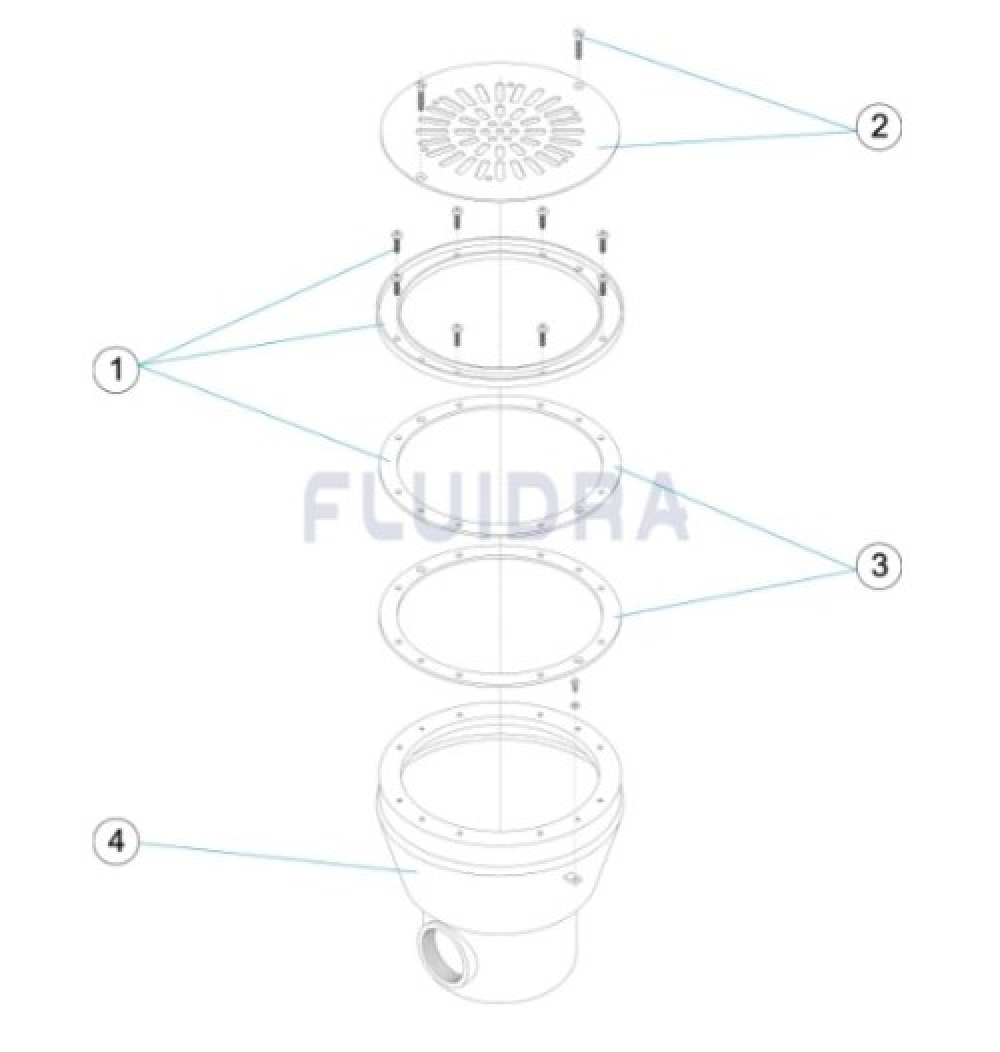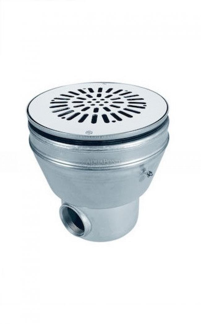 Dnový výpust pre fóliové a prefabrikované bazény. Vyrobený z nerezovej ocele AISI-316L. Upevnenie mriežky pomocou nerezových skrutiek, dodávaná vrátane podložiek, príruby a nerezových skrutiek.