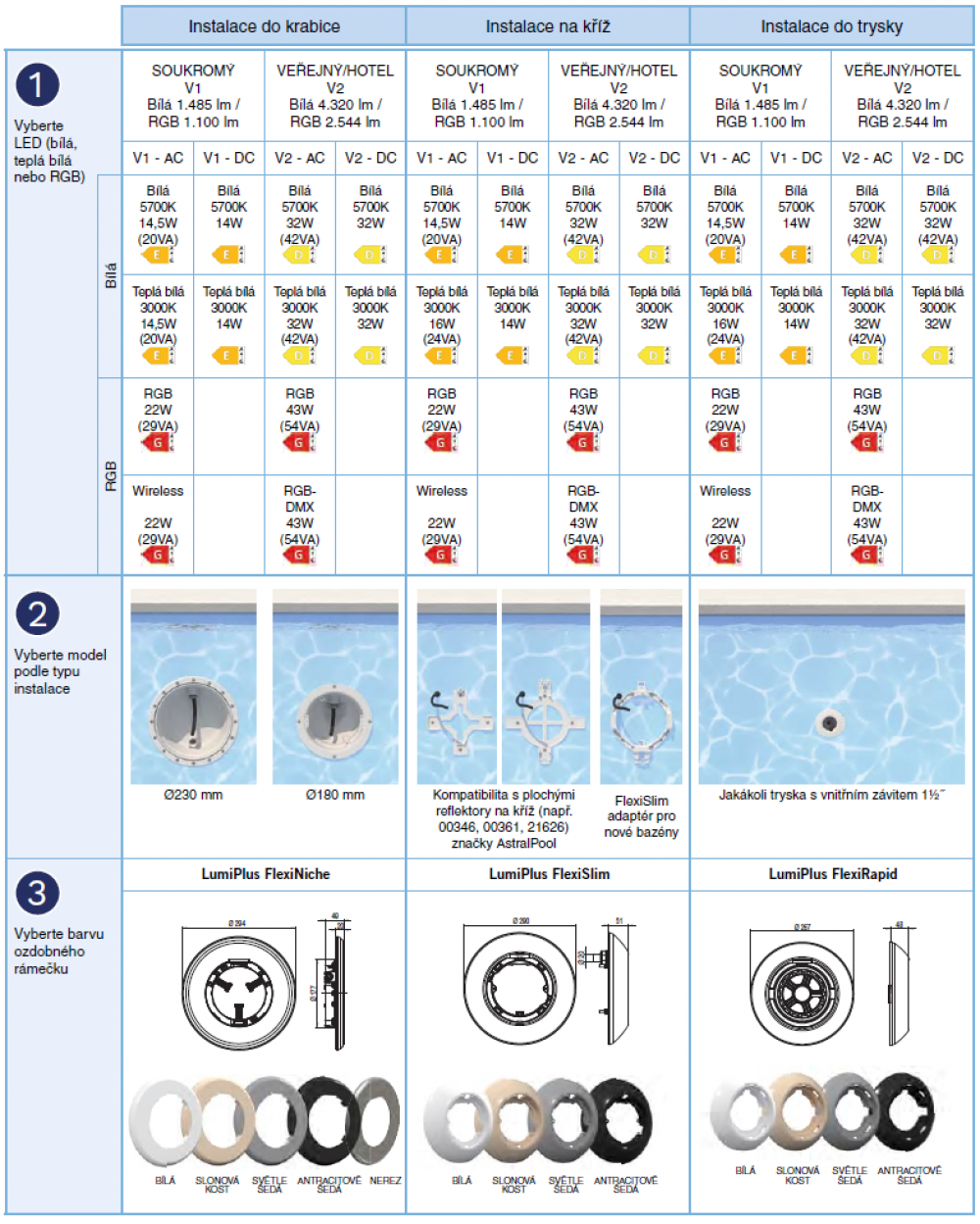 Možnosť výberu farebného prevedenia čelného krycieho rámika (biela, slonová kosť (RAL1015), svetlo šedá (RAL7004) antracitová šedá (RAL7016) alebo rám a ozdobná obrúčka z nerezu. Pasuje aj pre staršie inštalácie, kde jednoduchou zámenou získate nové a moderné LED bazénové svetlo. Navyše krycí rámik svetlo môže byť aj vo farbe fólie Vášho bazéna.
