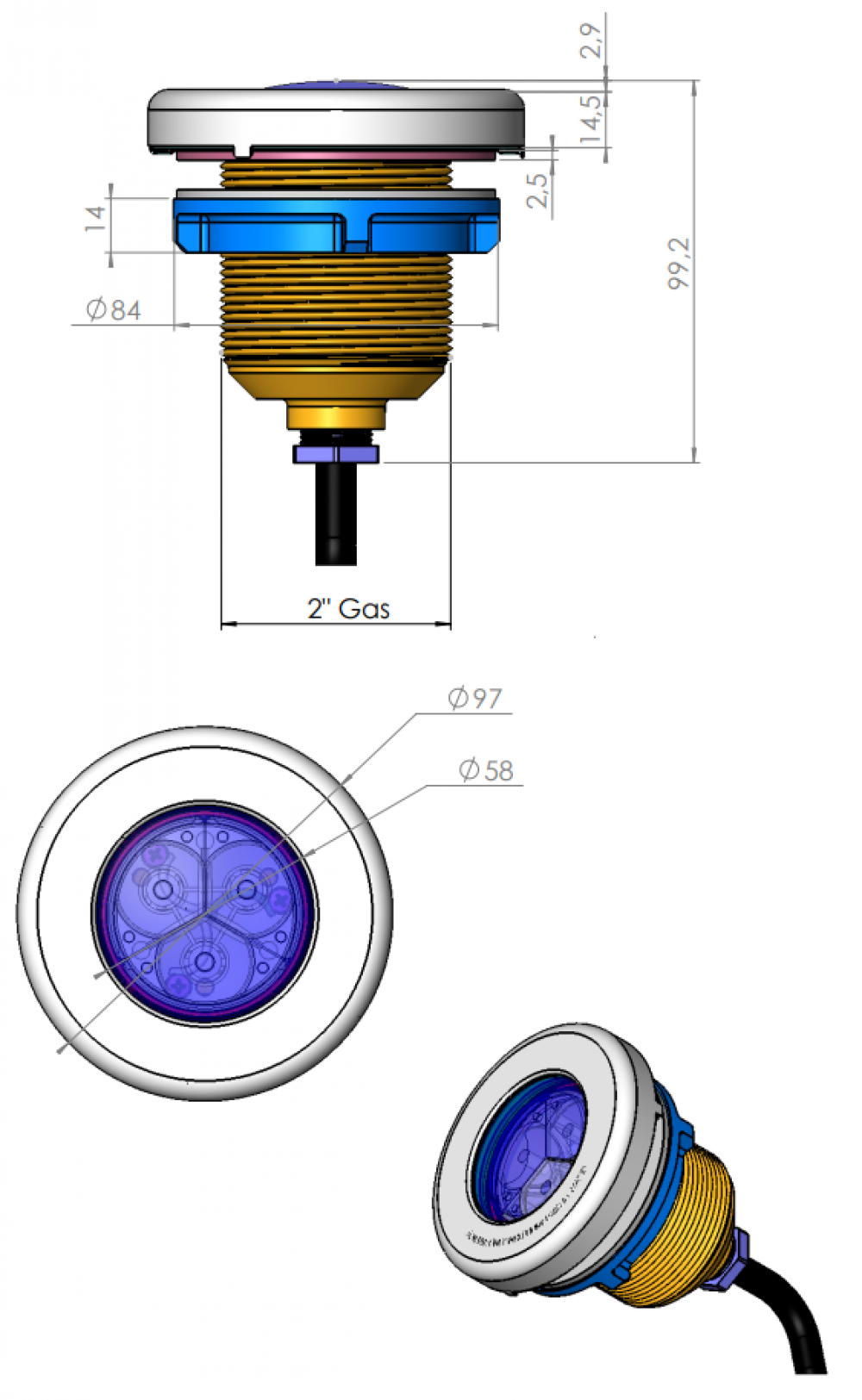 Astralpool reflektor s LED diodami LumiPlus Mini 2.11 V2 RGB farebné DMX 24 V DC - čelo ABS s prevlečnou matkou 2˝, pre všetky typy bazénov