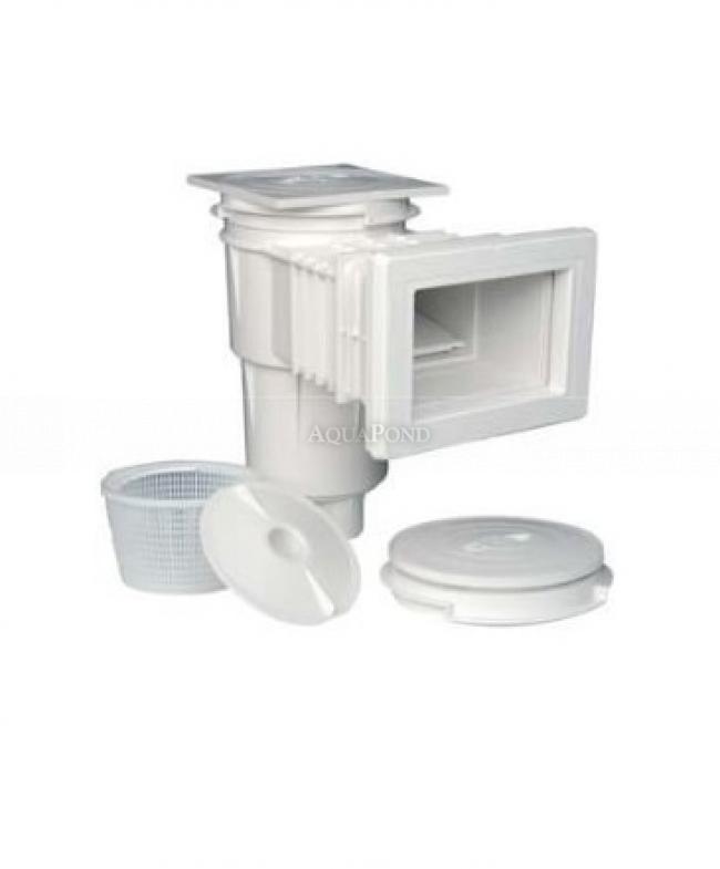 Skimmer pre betónové bazény s ozdobným rámčekom. Skimmer pre betónové bazény je určený pre bazény s keramickým obkladom alebo náterom. Telo skimmera je vyrobené z bieleho chemicky odolného ABS plastu odolného proti UV žiareniu. Odporúčame inštalovať 1 skimmer na 25 m2 vodnej hladiny bazéna. Horné napojenie na prepad pri vysokej hladine vody v bazéne vnútorným priemerom D 32 mm. Horné veko s poistkou v stredovej časti. Teleskopické osadenie horného veka dovoľuje regulovať výšku s dlažbou alebo s obvodovým kameňom. Do spodnej časti skimmera je vsadený vyberateľný košík s bajonetovým úchytom na zachytenie hrubých nečistôt.