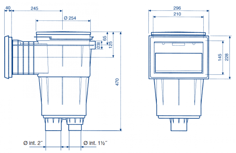 Skimmer pre betónové bazény s ozdobným rámčekom. Skimmer pre betónové bazény je určený pre bazény s keramickým obkladom alebo náterom. Telo skimmera je vyrobené z bieleho chemicky odolného ABS plastu odolného proti UV žiareniu. Odporúčame inštalovať 1 skimmer na 25 m2 vodnej hladiny bazéna. Horné napojenie na prepad pri vysokej hladine vody v bazéne vnútorným priemerom D 32 mm. Horné veko s poistkou v stredovej časti. Teleskopické osadenie horného veka dovoľuje regulovať výšku s dlažbou alebo s obvodovým kameňom. Do spodnej časti skimmera je vsadený vyberateľný košík s bajonetovým úchytom na zachytenie hrubých nečistôt.