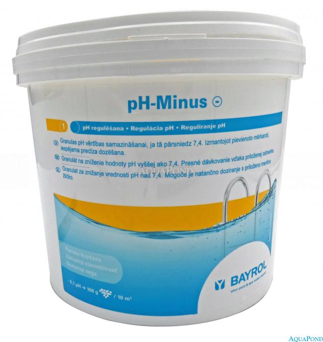 Aby bola dezinfekcia vody čo najúčinnejšia, mala by byť hodnota pH medzi 7,0 a 7,4. Aby zostali hodnoty pH optimálne, je potrebné ich merať a upravovať, v súkromných bazénoch 1 až 2 x týždenne, a vo verejných bazénoch sa doporučuje meranie vykonávať 3 x týždenne. Meranie sa vykonáva pomocou testovacích súprav. Na zníženie pH o 0.1 je potrebný 0,1 kg pH -Mínus na 10 m3 vody. pH -Mínus pridávajte postupne, blízko výtlačnej trysky alebo rovnomerne, na niekoľkých miestach v bazéne. Prípravok je vhodné vopred rozpustiť v nádobe s vodou. Nepridávajte pred filter ani pred výmenník. Nemiešajte s inými chemikáliami.