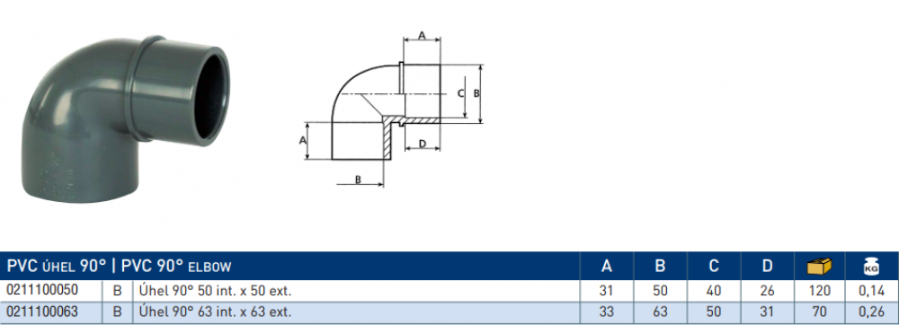 PVC tvarovka - koleno 90° 50 int. x 50 ext., DN=50 mm, d= 50 mm, lepenie / lepenie
