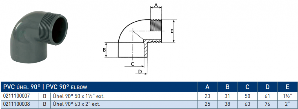 PVC tvarovka - Koleno 90° 50 mm lepenie / vonkajší závit 1 1/2“