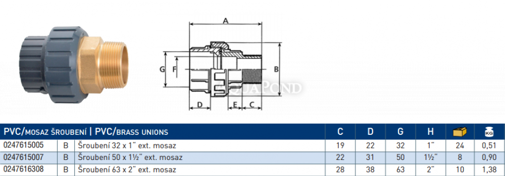 Používa sa na spojenie bazénového potrubia alebo bazénovej tlakovej hadice s tepelným výmenníkom alebo potrubím z iného typu materiálu. Výhodou PVC tvaroviek je ľahká manipulácia, jednoduchá montáž a chemická odolnosť tvaroviek.