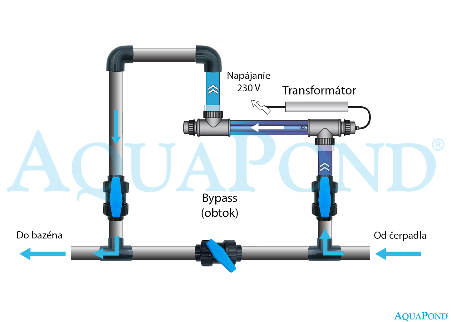 Dezinfekcia bazénovej vody pomocou UV lamp zníži spotrebu bazénovej chémie na minimum. UV lampa spoľahlivo likviduje baktérie v bazénovej vode a zamedzuje vzniku rias a siníc. Bazénová UV lampa sa inštaluje na výtlačné potrubie za bazénovú filtráciu. Najvhodnejšie je osadiť UV lampu do bypassu, kde bude pretekať potrebné množstvo vody, ktoré je dané prietokom konkrétnej UV lampy. Regulácia prietoku cez UV lampu zaisťuje dokonalú dezinfekciu pretekajúcej vody do bazéna. UV lampu je možné namontovať aj do už existujúcej bazénovej technológie.