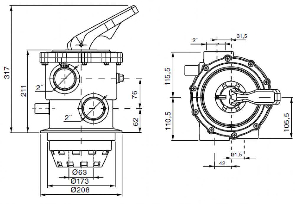Šesťcestné ovládacie ventily sú používané pre prepínanie šesť hydraulických operácií filtračného procesu: filtrovania, preplach, sedimentačnej preplach, recirkulácie, vypúšťanie a zatvorené. Je určený k filtrom pre súkromné bazény. Telo ventilu, veko aj ovládacia páka vyrobené z ABS plastu.