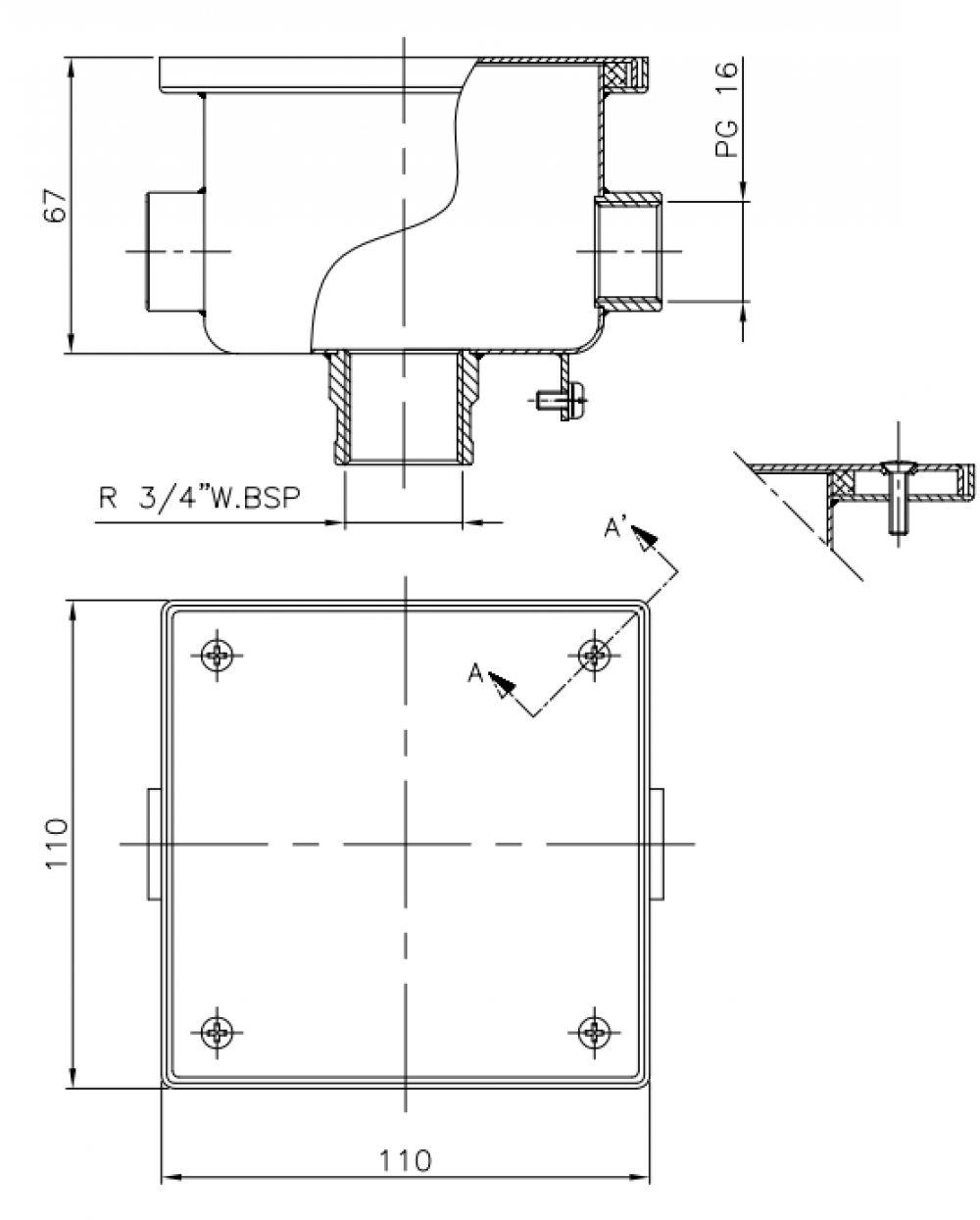 Celonerezová prepojovacia krabica ku svetlu je vyrobená z nerezovej ocele AISI-316, dva bočné výstupy s vnútorným závitom PG-16, s dvoma adaptérmi z PG-16 na M25, spodný výstup vnútorným závitom 3/4". Slúži k spojeniu prívodného káblu od transformátora a káblu od svetla.