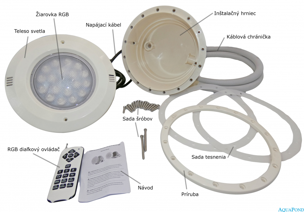 Kompletné bazénové osvetlenie LED-STAR MULTICOLOR SET RGB s diaľkovým ovládaním je určené pre všetky typy bazénov. Osvetlenie je osadené bazénovou žiarovkou LED-STAR MULTICOLOR (viac o žiarovke nižšie)* . Svetlomet je dodávaný s prírubou a sadou tesnenia. Žiarovka má inštalovaný RGB prijímač, ovládanie je diaľkovým ovládačom, prípadne manuálne spínačom. Diaľkový ovládač je súčasťou svetlometu. Počet farebných režimov 14. Svetlomet odporúčame na inštaláciu do bazéna osadeným jedným svetlom. Pre bazény osadené viacerými svetlami s požiadavkou na synchronizáciu farebných režimov sú určené svetlá LED-STAR MULTICOLOR rady G3.1 a WI-FI.