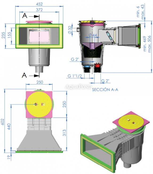 Skimmer je osadený vnútornou plávajúcou jednotkou na reguláciu prietoku vody tak, aby nedochádzalo k zavzdušneniu sacieho čerpadla. V spodnej časti skimmera je odnímateľný košík, ktorý zachytáva veľké nečistoty a malé predmety, čím zabráni ich priechodu do bazénovej filtrácie.