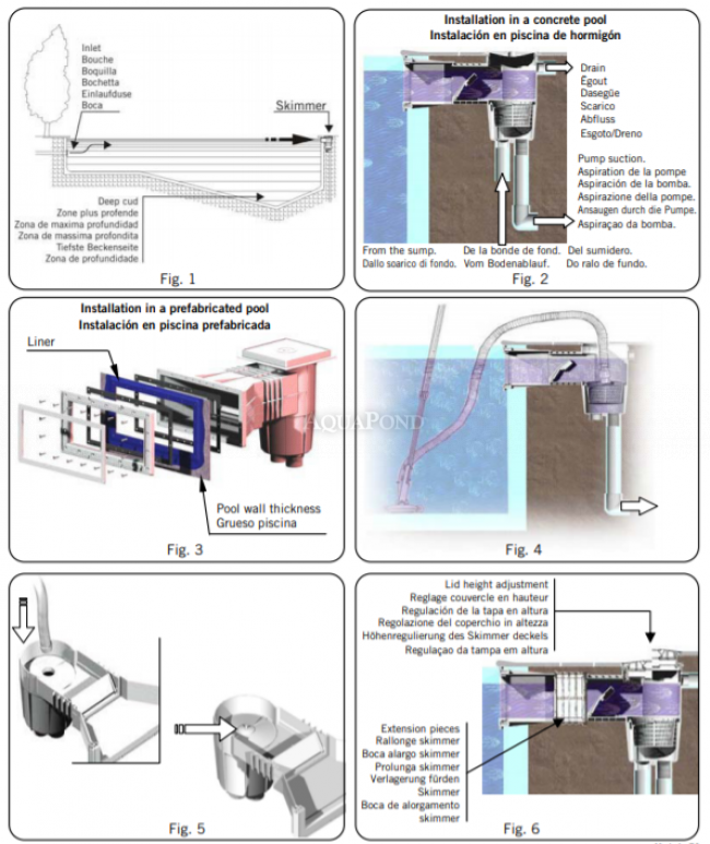 Skimmer je určený pre betónové bazény s fóliou, bazény s oceľovou stenou a pre plastové bazény z laminátu alebo polypropylénu. Telo skimmera je vyrobené z bieleho chemicky odolného ABS plastu odolného proti UV žiareniu. Na utesnenie k fólii slúži dvojité tesnenie s protiprírubou a okrasnou krytkou. Odporúčame inštalovať 1 skimmer na 25 m2 vodnej hladiny bazéna.