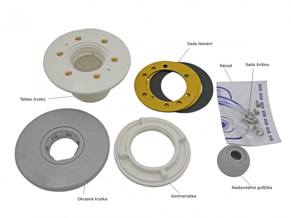 Vyrobená z bieleho alebo farebného ABS plastu, dodáva sa vrátane tesnenia. Upevnenie príruby pomocou skrutiek do mosadzných zápustkov. Pri betónových bazénoch s fóliou sa odporúča inštalovať s priechodkou.