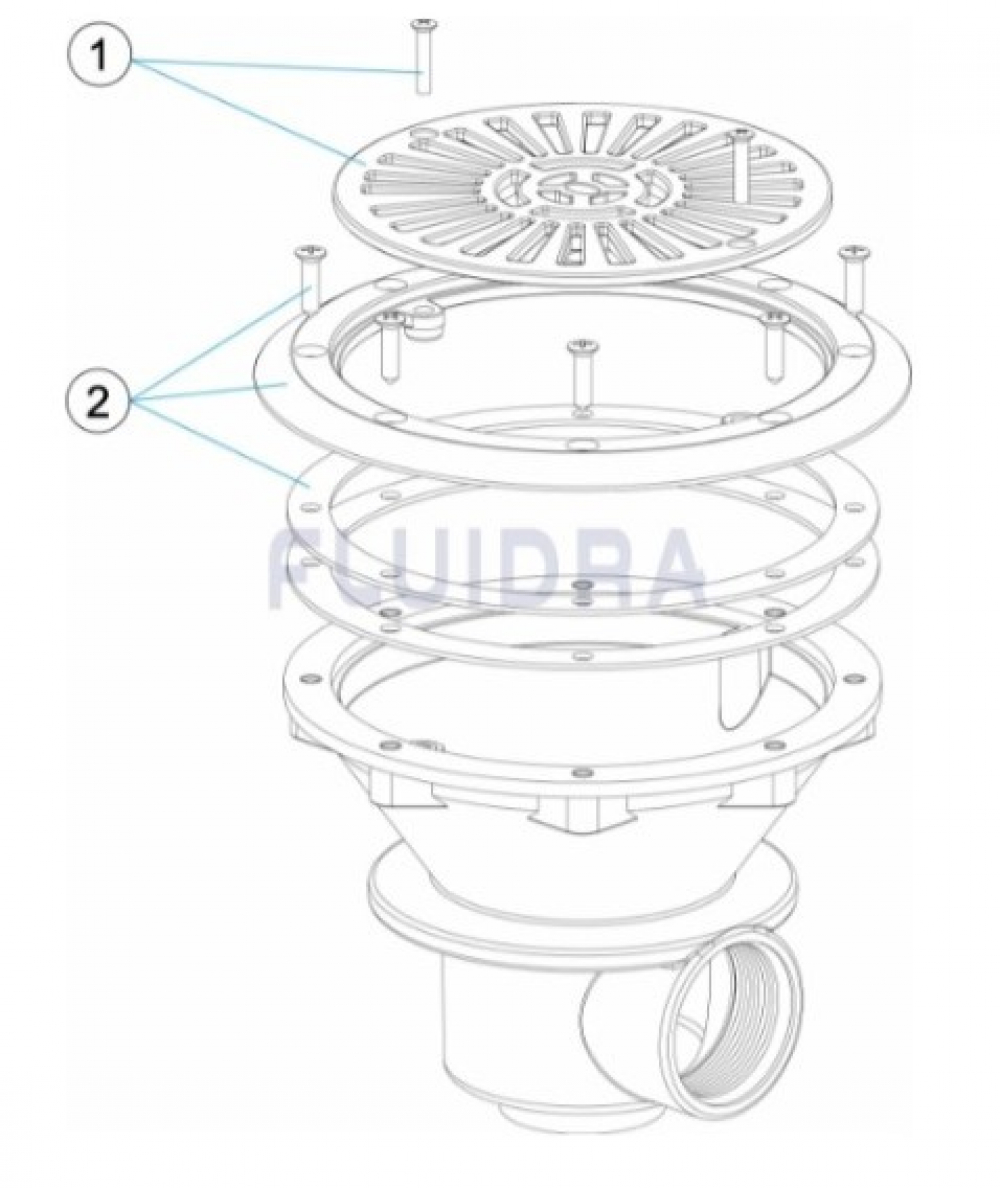 Dnový výpust pre fóliové a prefabrikované bazény. Vyrobená z bieleho alebo farebného ABS plastu odolného voči UV žiareniu. Dodávaná vrátane tesnení. Mriežka a príruba je upevnená pomocov šróbov s mosadznými závitmi, čo predlžuje životnosť a zvyšuje pevnosť tesniacich dielov. Najčastejšie sa používa pre fóliové bazény, prípadne dá sa použiť aj pre prefabrikované bazény.