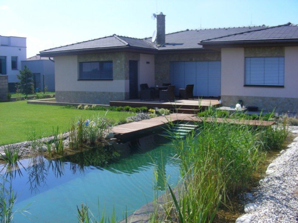2. Technologická časť realizácie, ktorá obsahuje návrh biobazéna/kúpacieho jazierka, dodávku a montáž 1,5 mm hrubej hydroizolačnej fólie s geotextíliou, skúšku vodotesnosti, skimmer - hladinový zberač, čerpadlá, rozvodovú čerpadlovú šachtu s ventilmi, rozvodné potrubia, biologický filtračný systém, filtračné vrstvy, rastlinné substráty, riečny štrk, pramenný kameň, vodné rastliny, vysávač dnových nečistôt, sieťku, kefku, dekoračné kamene, vodné osvetlenie 300 W/12 V, dažďový prepad, elektrický rozvádzač a záruku 2-5 rokov. Cena technologickej časti biobazéna/kúpacieho jazierka s vodnou plochou okolo 45-50 m2 sa začína od cca 9.000 Eur.