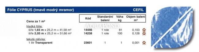 Cefil CYPRUS je vyrobená z dvoch vrstiev mäkčeného PVC, medzi ktorými sa nachádza polyesterová mriežka. Vďaka nej si fólia výborne drží tvar, je veľmi pevná a odolná proti pretrhnutiu. Ochranný lak na povrchu fólie zaisťuje ochranu pred UV žiarením, mastnými a ďalšími nečistotami v bazéne. Jeho zloženie zároveň bráni šíreniu mikroorganizmov a plesní. Celkové vyhotovenie fólie je veľmi odolné voči pôsobeniu chemických prípravkov na údržbu vody v bežných dávkach.