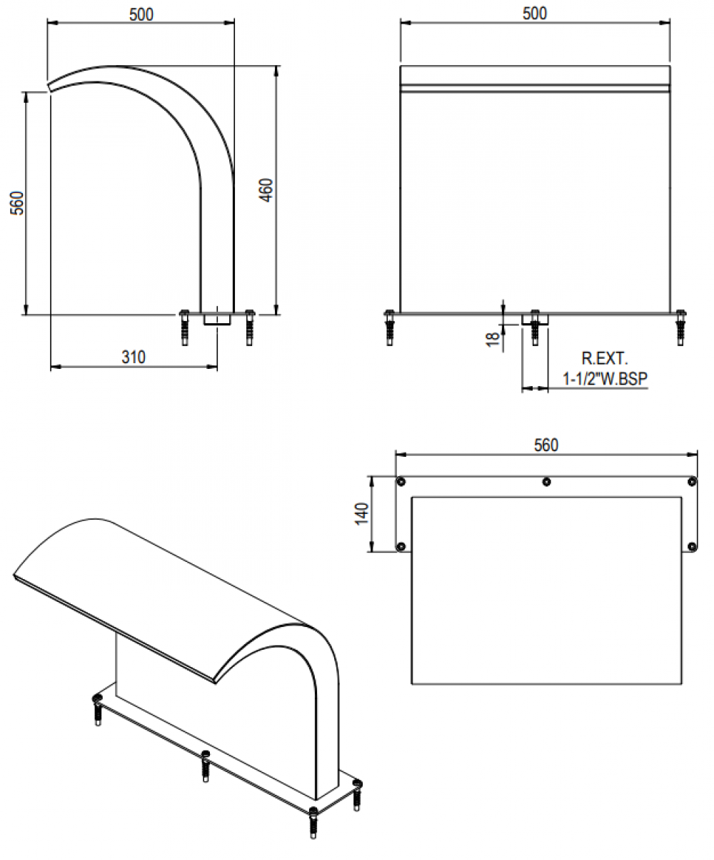 Jedná sa o doplnok k bazénu - chrlič vody patrí k obľúbeným vodným atrakciám, ktorý tvorí efektný vodopád. Z nerez ocele AISI-316. Chrliče sa umiestňujú na okraj bazéna, prepájajú sa pomocou samostatného cirkulačného okruhu. Výkon čerpadla je nutné voliť v závislosti na veľkosti otvoru chrliča, vzdialenosti a záhybov potrubia a očakávanej intenzity prúdu vody. Upevnenie k podlahe pomocou skrutiek a hmoždiniek. Sú dve možnosti, ako zapínať bazénový chrlič: nástenným vypínačom osadeným na stene v hale bazéna alebo spínačom osadeným priamo na stene vnútri bazéna. Pripojenie vody vonkajším závitom 1½˝. Sanie, čerpadlo a elektrickú skrinku treba zakúpiť osobitne.