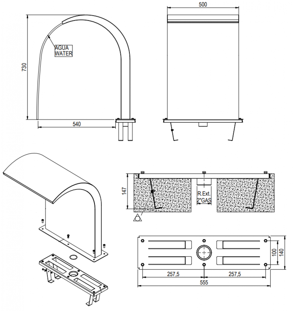 Jedná sa o doplnok k bazénu - chrlič vody patrí k obľúbeným vodným atrakciám, ktorý tvorí efektný vodopád. Z nerez ocele AISI-316. Chrliče sa umiestňujú na okraj bazéna, prepájajú sa pomocou samostatného cirkulačného okruhu. Výkon čerpadla je nutné voliť v závislosti na veľkosti otvoru chrliča, vzdialenosti a záhybov potrubia a očakávanej intenzity prúdu vody. Upevnenie k podlahe pomocou skrutiek a hmoždiniek. Sú dve možnosti, ako zapínať bazénový chrlič: nástenným vypínačom osadeným na stene v hale bazéna alebo spínačom osadeným priamo na stene vnútri bazéna. Pripojenie vody vonkajším závitom 1½˝. Sanie, čerpadlo a elektrickú skrinku treba zakúpiť osobitne.