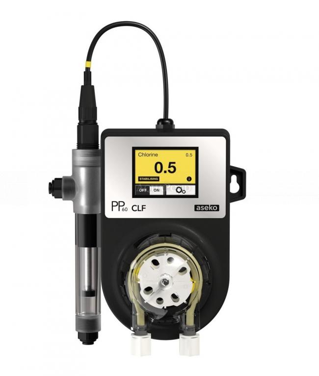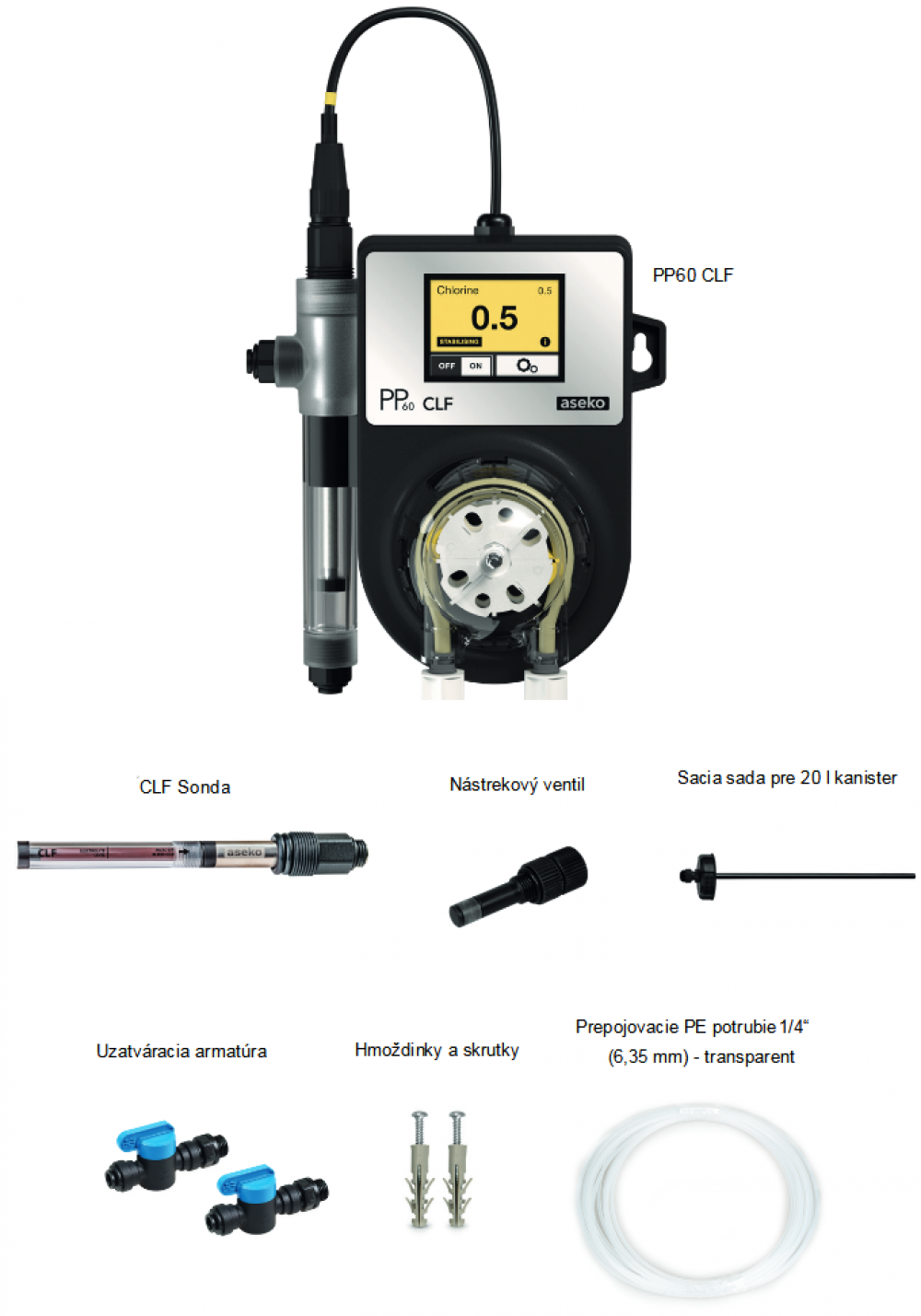 PP60 CLF presne meria hodnotu voľného chlóru v bazénovej vode pomocou vysoko presnej sondy Aseko CLF a na základe týchto meraní automaticky reguluje dávkovanie chlóru. Zariadenie je vybavené vysoko kvalitným peristaltickým čerpadlom s maximálnym výkonom 3,6 l / h. Všetky informácie sú prehľadne zobrazené na dotykovom displeji, ktorý zároveň slúži na jednoduché nastavenie všetkých dôležitých prevádzkových parametrov. PP60 CLF sa skladá z riadiacej jednotky, meracej sondy a dávkovacieho čerpadla.