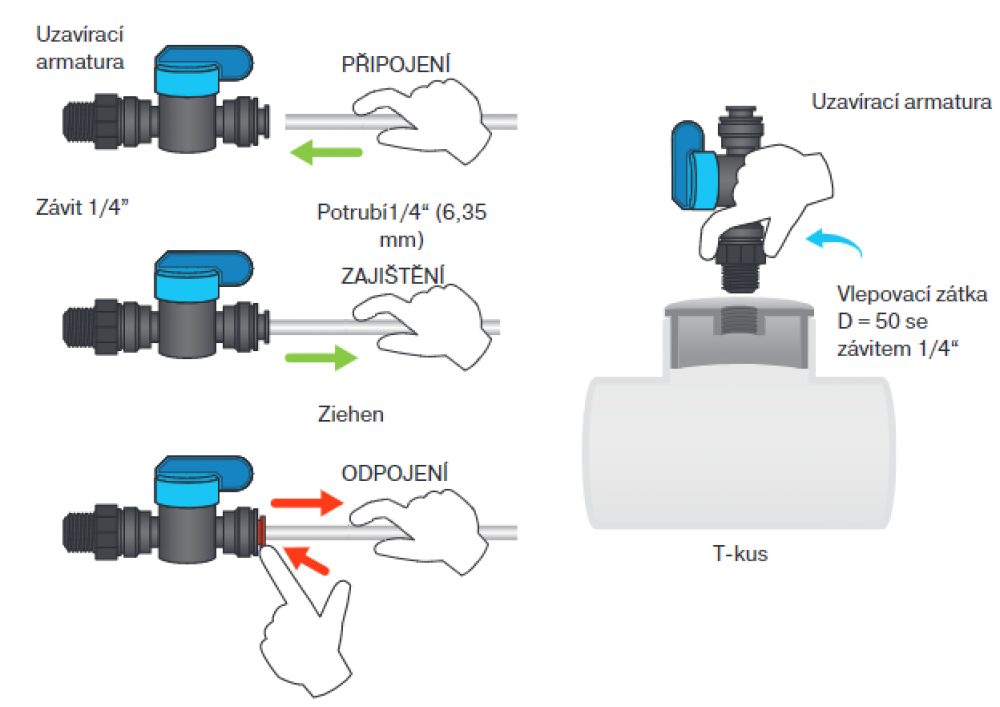 Bazénovú vodu určenú na meranie je nutné priviesť k sonde PP60 Redox. Uzatváraciu armatúru umiestňujeme do zátky D=50 so závitom G1/4“, vlepenej do T-kusu. Doťahujte iba rukou. Nepoužívajte kliešte alebo iné náradie.