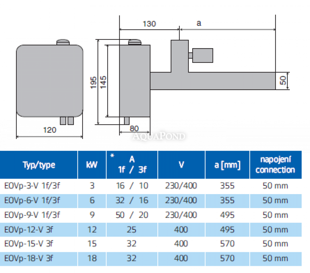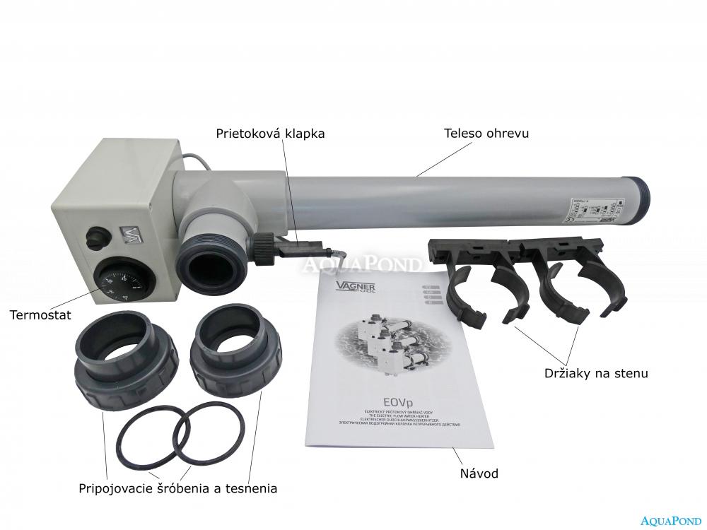 Bazénový elektrický prietokový ohrievač vody EOVp je svojou konštrukciou špeciálne navrhnutý pre vykurovanie bazénovej vody, alebo vody v iných vodných okruhoch s prietokom a teplotou do 40 ° C. Ohrievač musí byť v elektrickej sústave nainštalovaný za prúdovým chráničom. Odporúčame teda zariadenie doplniť vhodným typom automatického ovládania. Rozdiel medzi EOV a EOVp je v použití plastu na vlastné telo plášťa a v použití prietokové klapky namiesto tlakového spínača ako ochranného prvku pre prietok vody.