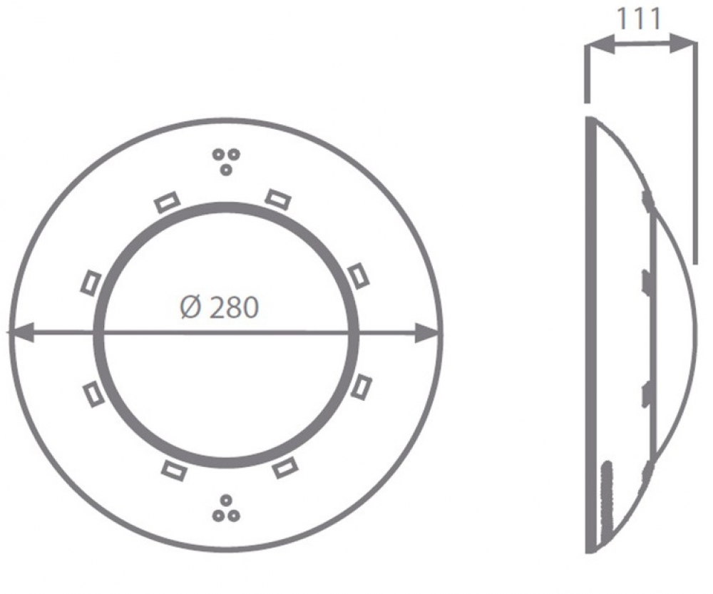 Plochý reflektor s bielym svetlom s nízkym príkonom. Inštaluje sa pomocou dodávaného nosného kríža. Je vhodný na inštaláciu do všetkých typov bazénov okrem panelového. Je kompatibilný so všetkými dostupnými riadiacimi systémami pre reflektory AstralPool LED. Svietidlá sa dodávajú s odpojiteľným káblom H07RN-F s rozmermi 2 x 1,5 mm2 a dĺžkou 2,5 m. Odporúča sa inštalácia reflektora na každých 20 m2 vodnej plochy. Transformátor nie je súčasťou dodávky. Vonkajší priemer svetla 280 mm.
