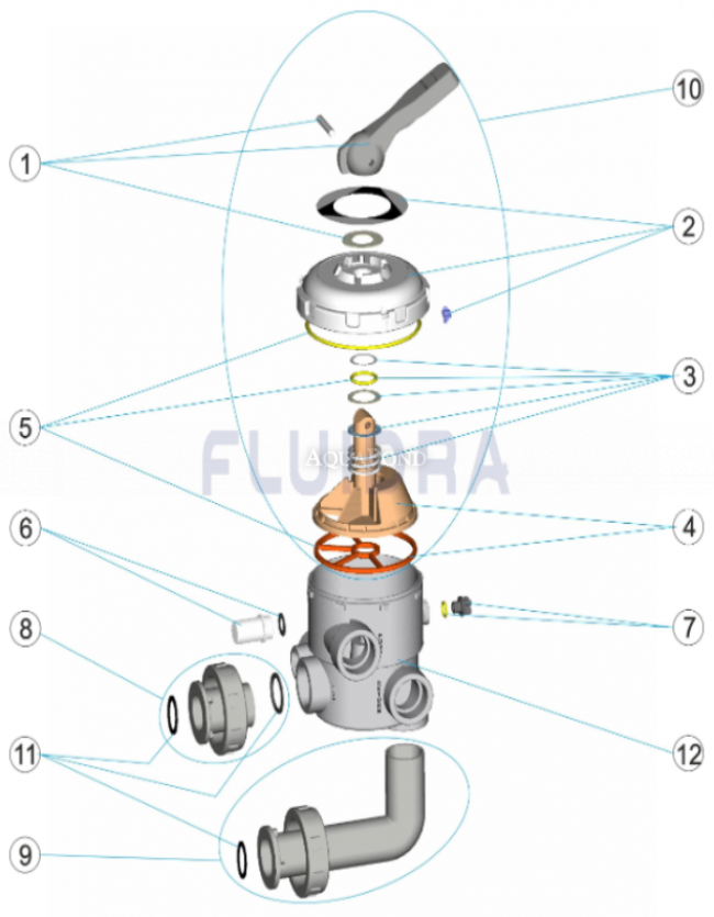 Náhradné diely pre šesťcestný ventil bočný pre filtre Cantabric, Bilbao, RapidPool, UVE, Vesubio, Atlas, Millenium - pripojenie 1 ½"