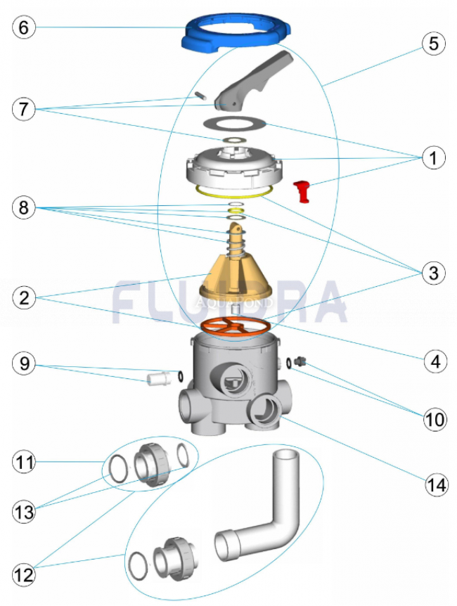 Náhradné diely pre šesťcestný ventil bočný pre filtre Cantabric, Bilbao, RapidPool, UVE, Vesubio, Atlas, Millenium - pripojenie 2’’