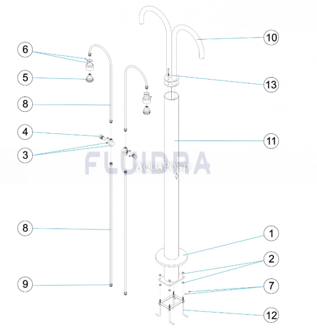 Náhradné diely pre sprchu k verejným bazénom s 2 kropítkami a 2 automatickými ventilmi AISI 316