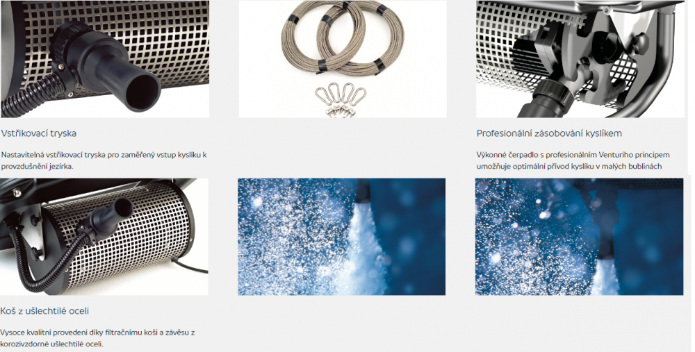Prevzdušňovač AquaAir vhodné pre chovné rybníky, jazerá s vodnými plochami s vodnou hladinou do 250 m2. Nastaviteľná vstrekovacia tryska optimálne prevzdušňuje do hĺbky 4 metrov. Vysoká výmena kyslíku s vodou prináša do stojacej vody život. Extrémna životnosť vďaka vysoko-kvalitnému remeselnému spracovaniu a elementov z nerezovej oceli. Veľmi nízky hluk pod hladinou. Upevňovací materiál je súčasťou dodávky. Optimálna dodávka kyslíka vďaka drobným bublinkám.