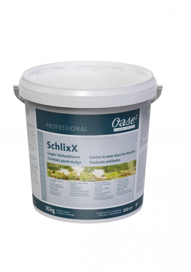 SchlixX znižuje usadeniny organického kalu a je dvojnásobne účinná v boji proti rozkladu a tvorbe nebezpečných plynov. Vytvára ideálne prostredie pre mikrobiálnu degradáciu organického kalu. Voľné živiny a iná organická hmota väčšinou fosfáty, sa často usadzujú na dne a vytvárajú vrstvu kalu. SchlixX uvoľňuje veľké množstvo kyslíka, čo vedie k dvom účinkom: V mineráli apatite natrvalo a nerozpustne viaže fosfát a pri tom uvoľňuje kyslík. Mikroorganizmy prítomné vo vode ho využívajú na rozklad organického materiálu. Väzbou fosfátu, ktorý je hlavnou potravou rias, SchlixX zabraňuje tvorbe rias a umožňuje tak trvalé zníženie množstva rias žijúcich vo vode. Výrazne sa tak znižuje množstvo kalu a získava sa objem vody. Znižuje sa aj pravdepodobnosť výskytu siníc. Je obzvlášť šetrný k rastlinám a živočíchom, pôsobí prirodzene vďaka mikroorganizmom. SchlixX zostáva na dne vody až 6 týždňov a zvyčajne odstraňuje 80% organických usadenín. Pred použitím produktu odporúčame kal najskôr analyzovať, aby ste určili presné zloženie vodného dna.