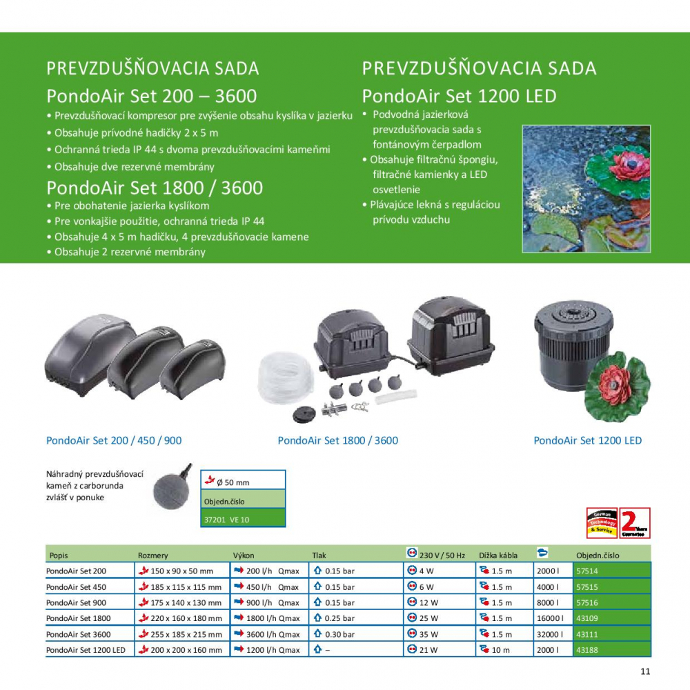 PondoAir Set 3600 slúži na obohatenie jazierka kyslíkom. Sada je vhodná na vonkajšie použitie, ochranná trieda IP 44. Pozostáva zo vzduchového čerpadla, 4 x 5 vzduchovej hadice, 4 vzduchových kameňov a obsahuje 2 rezervné membrány.