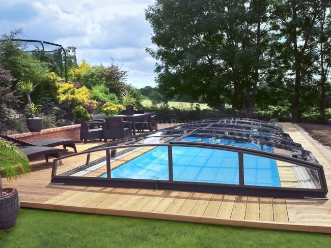 • Najnižšie prestrešenie bazéna z radu AZURE kombinuje oblú strechu a šikmé steny. Vďaka tomu získava prestrešenie veľmi ladný a zároveň moderný tvar, ktorý sa hodí do každej záhrady.