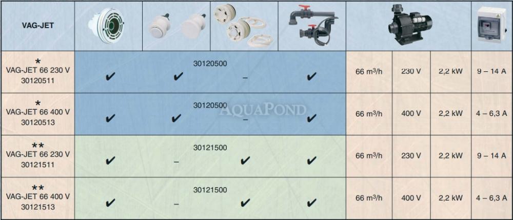 Toto protiprúdové zariadenie je vhodné pre všetky druhy bazénov a podľa typu sa rozlišuje pre bazény predvyrobené, fóliové alebo betónové a to rozdielnou výbavou. Celé zariadenie VAG-JET je pripravené na jednoduché nainštalovanie kompletne v kartóne. VAG-JET je možné dodať aj po častiach a to: