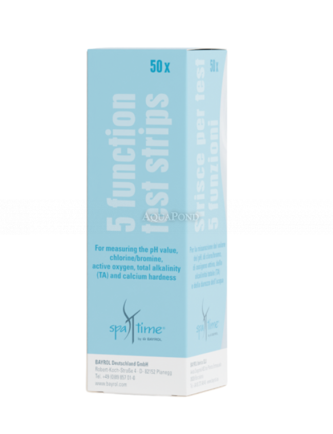 Spa Time testovacie prúžky 5v1 slúžia na meranie hodnoty pH, chlór / bróm, aktívny kyslík, celková alkalinita (TA) a tvrdosť vody.