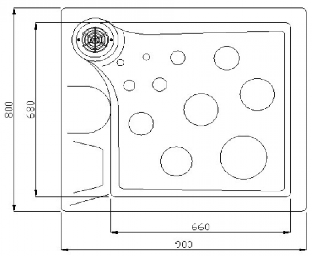 Bazénová sprchová vanička vyrobená z polyesterového sklolaminátu. Veľká odpadová mriežka z nerezovej ocele je oddelená od protišmykovej plochy vaničky. Hlavným cieľom vaničky je zabrániť vnášaniu nečistôt do bazéna a ušetriť tak prácu a chémiu potrebnú na jeho čistenie.