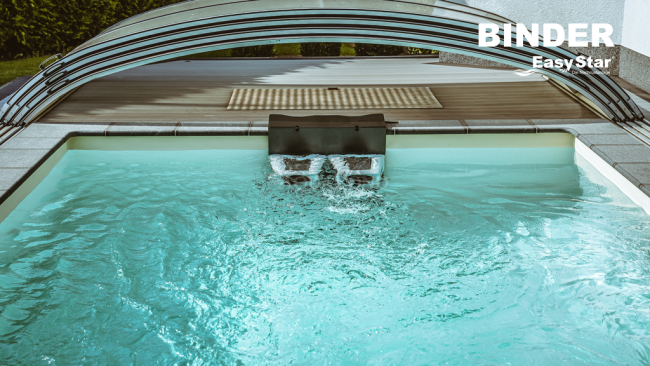 EasyStar od spoločnosti Binder jedinečný protiprúdový systém prináša do vášho domova prirodzený pocit z plávania. Turbiny vytvárajú rozsiahly, rovnomerný a výkonný prúd. S individuálne nastaviteľným prúdom - pre všetky požiadavky. Široký, silný prúd: ideálne pre vytrvalostné plávanie alebo relaxačnú vodnú gymnastiku. Toto umožňuje patentovaná technológia: turbíny vytvárajú rozsiahly, rovnomerný a silný prúd, o ktorého sile rozhodujete Vy. EasyStar je vhodný aj pre veľmi malé bazény. S minimálnou dĺžkou len 4,50 m a šírkou len 2,50 m. Patentovaná technológia už získala množstvo prestížnych ocenení vrátane Golden Wave Award, German Brand Award a Plus X Award. Načerpajte energiu, a nechajte sa unášať prúdom - Vaše wellness pre dušu.