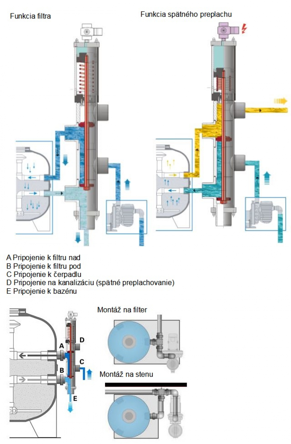 V prípade výpadku elektrického napájania sa ventil automaticky prepne späť do polohy "FILTROVANIE", nehrozí teda problém s prípadným zaseknutím v medzi polohe ak neúmyselnému vypusteniu vody z bazéna ako v prípade mechanického poškodenia u automatických 6-cestných ventilov.
