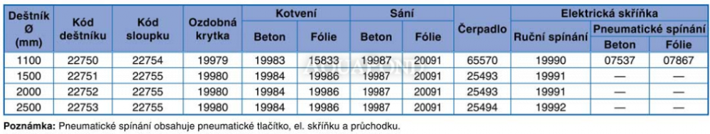 Jedná sa o doplnok k bazénu - vodný dáždnik patrí k obľúbeným vodným atrakciám. Z nerez ocele AISI-316, dáždnik z červeného polyesterového sklolaminátu. Výkon čerpadla je nutné voliť v závislosti na veľkosti otvoru, vzdialenosti a záhybov potrubia a očakávanej intenzity prúdu vody. Treba umiestniť na okraj bazéna. Upevnenie k podlahe pomocou skrutiek a hmoždiniek. Sú dve možnosti, ako zapínať: nástenným vypínačom osadeným na stene v hale bazéna alebo spínačom osadeným priamo na stene vnútri bazéna. Pripojenie vody vonkajším závitom 3˝.