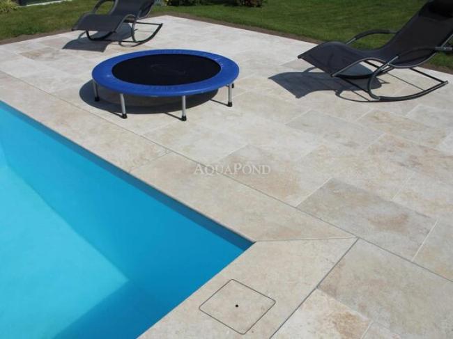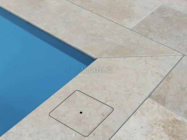 Otvor na skimmer aj s poklopom vyrezaný z dlažby je elegantné riešenie ako zjednotiť vzhľad okolia bazénu.