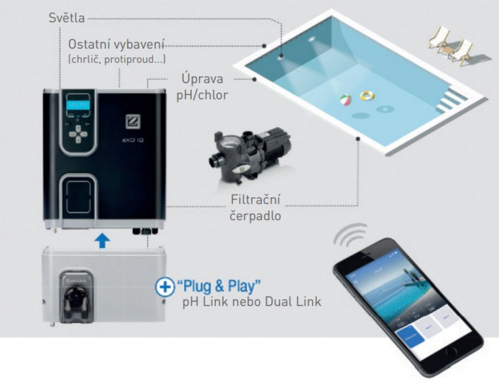 Zodiac EXO® iQ je systém, ktorý sám o sebe dokáže percentuálne vytvárať chlór (elektrolýza soli) rovnako ako Ei2 či Ei2 Expert. Jednotku EXO® iQ je ale možné rozšíriť o prídavný modul „pH Link“ alebo „Dual Link“.